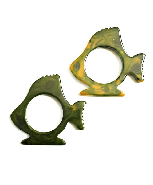 TWO GREEN YELLOW BAKELITE FISH NAPKIN/SERVIETTE RINGS