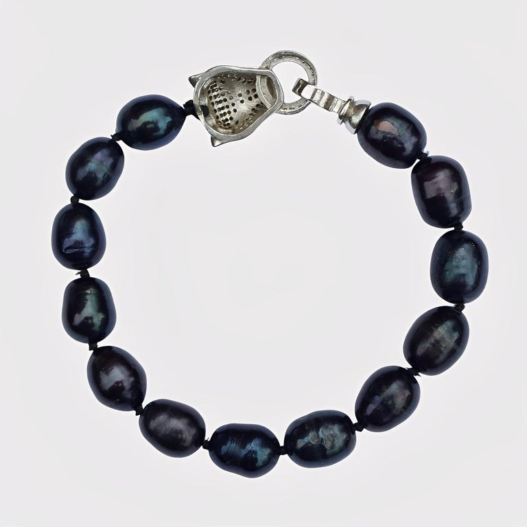 Wonderful iridescent blue glass bead bracelet, featuring a silver tone pavé panther clasp with green eyes. The beads are knotted between each bead. They have some wear.