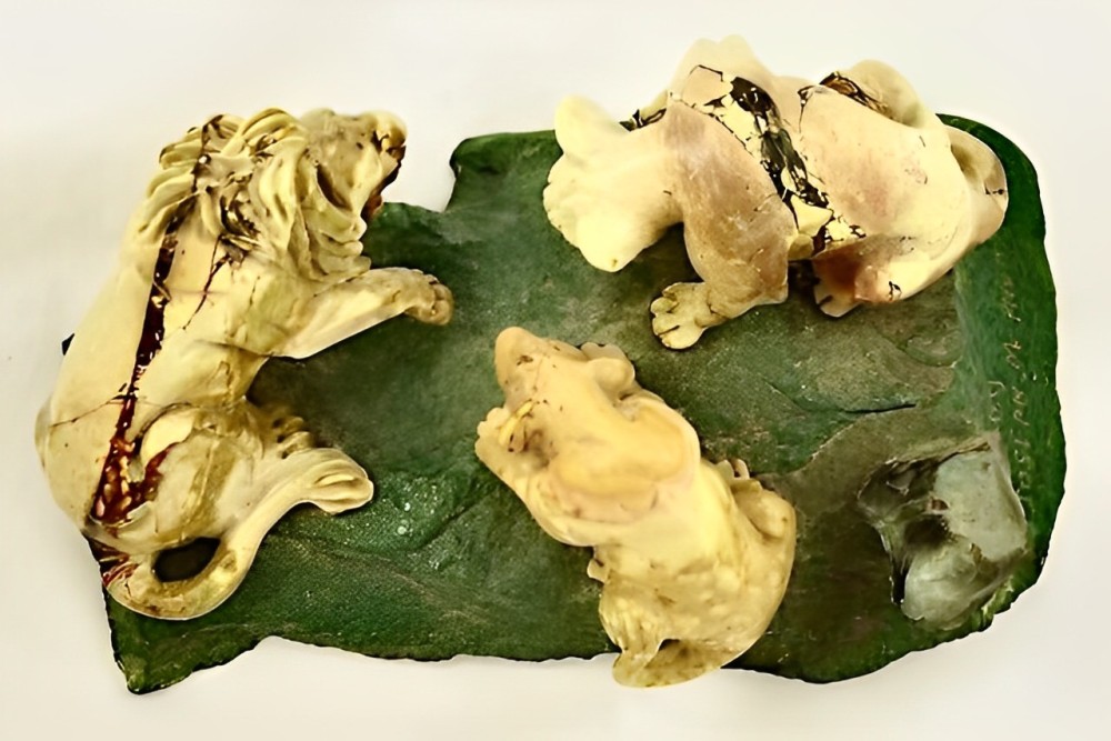 Heavy carved stone sculpture of a family of African lions. This unusual sculpture is in very good condition, the male lion is a little loose on the base.