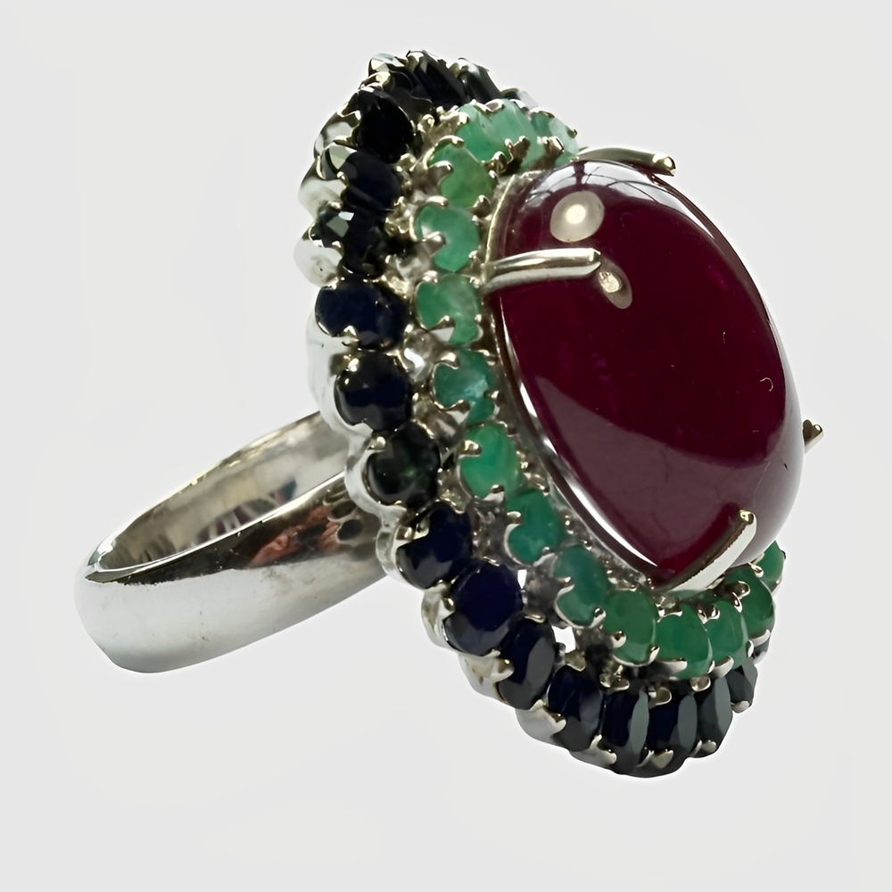Fabulous sterling silver ring, featuring a centre ruby surrounded with blue sapphire and emerald gemstones.