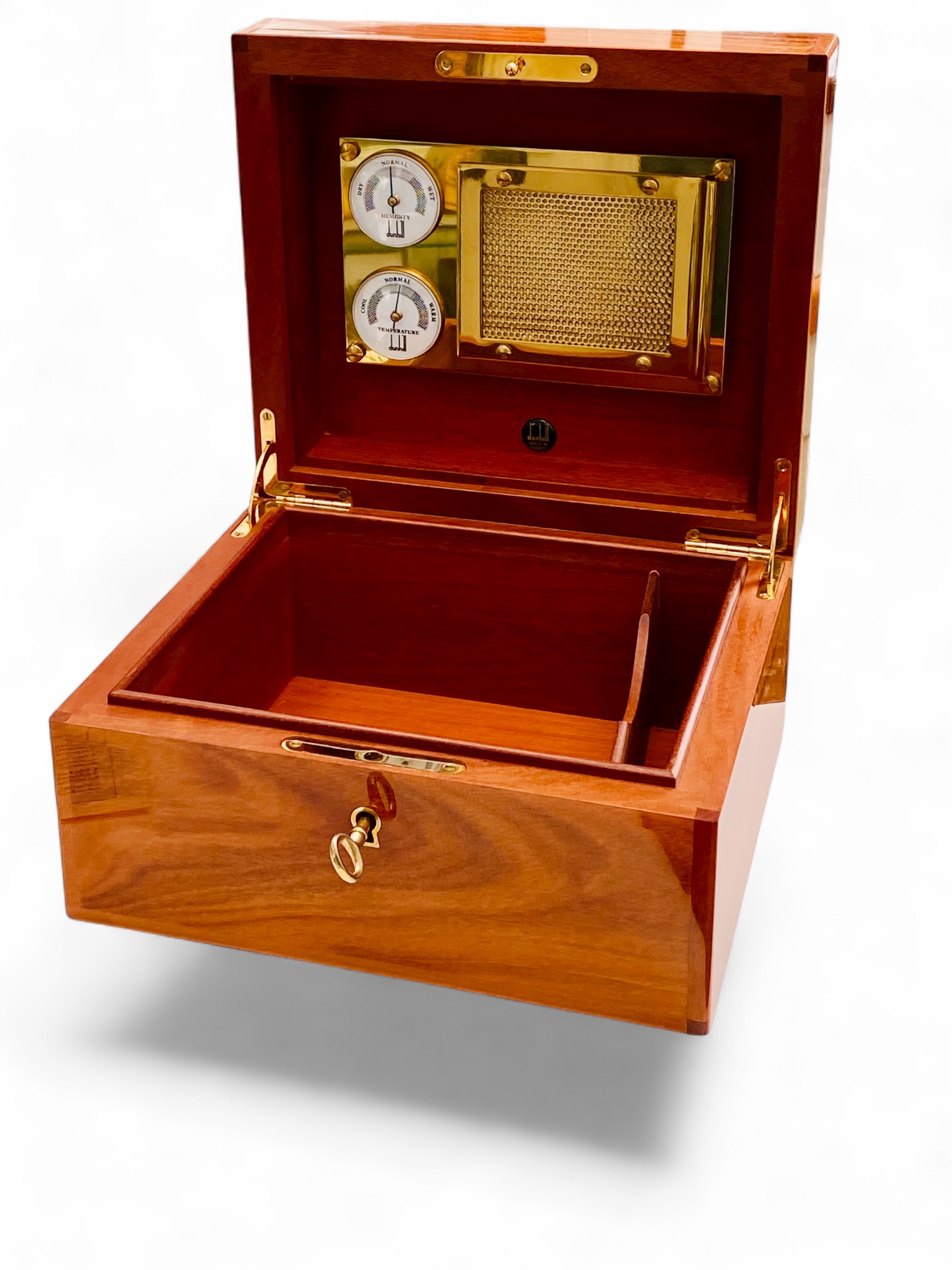Beautifully crafted Dunhill ‘Humiditempograph’ with mahogany case and cedar wood lining. It has a hinged lid and working lock with original key. Internally, there are both humidity and temperature gauges, along with a bespoke section divider.