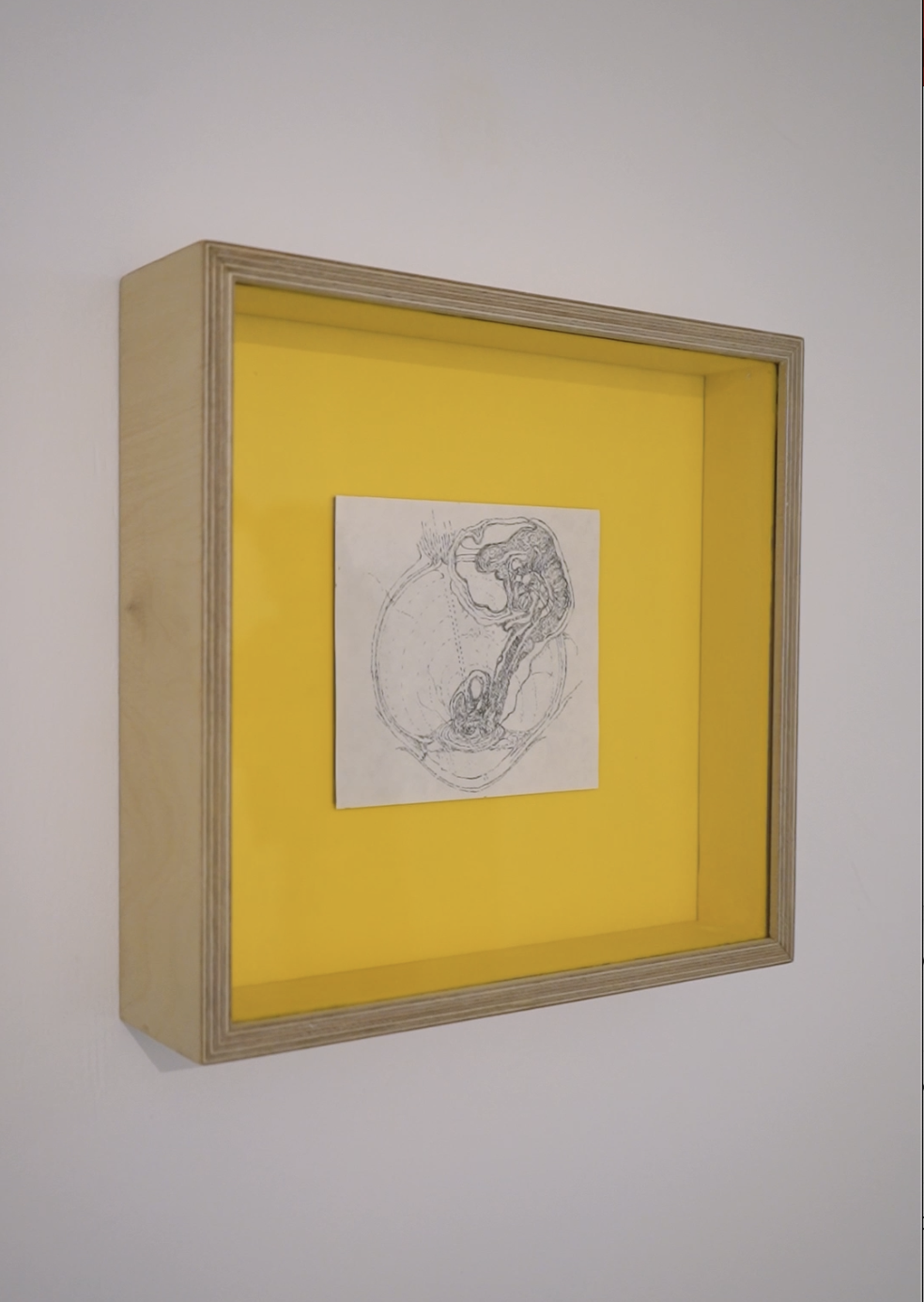 Drawing inspiration from medical studies of the human eye, Offord reimagines inner worlds where staircases spiral from lenses, cell structures morph into flora, and the body becomes a mysterious terrain. Framed under glass dotted like the eye’s own vitreous fluid, each piece evokes both scientific precision and surreal imagination.