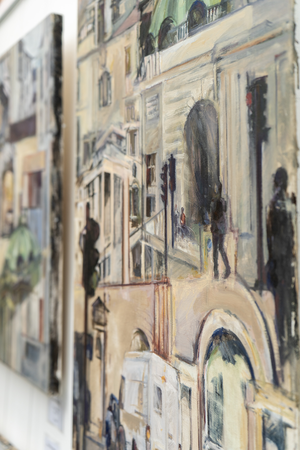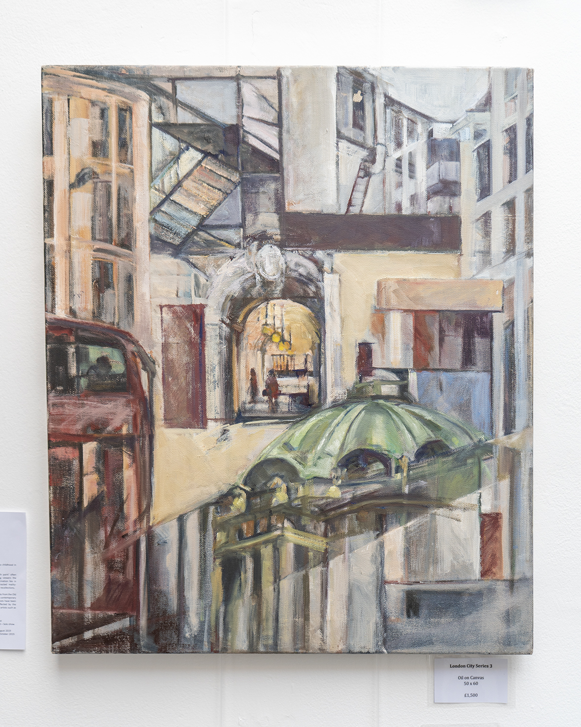 Kalpna works mostly in oils, occasionally using acrylics to build up the underpainting layers or to create a tension between the matte of acrylics and lustre of oil. The medium and process applied are a response to the image as in construction site paintings of the South Bank, Marble Arch and Piccadilly, where the paintings are built up with layers of scumbled brushstrokes, to a more ephemeral feel as in ‘Khan Market’ created by a reductive process.