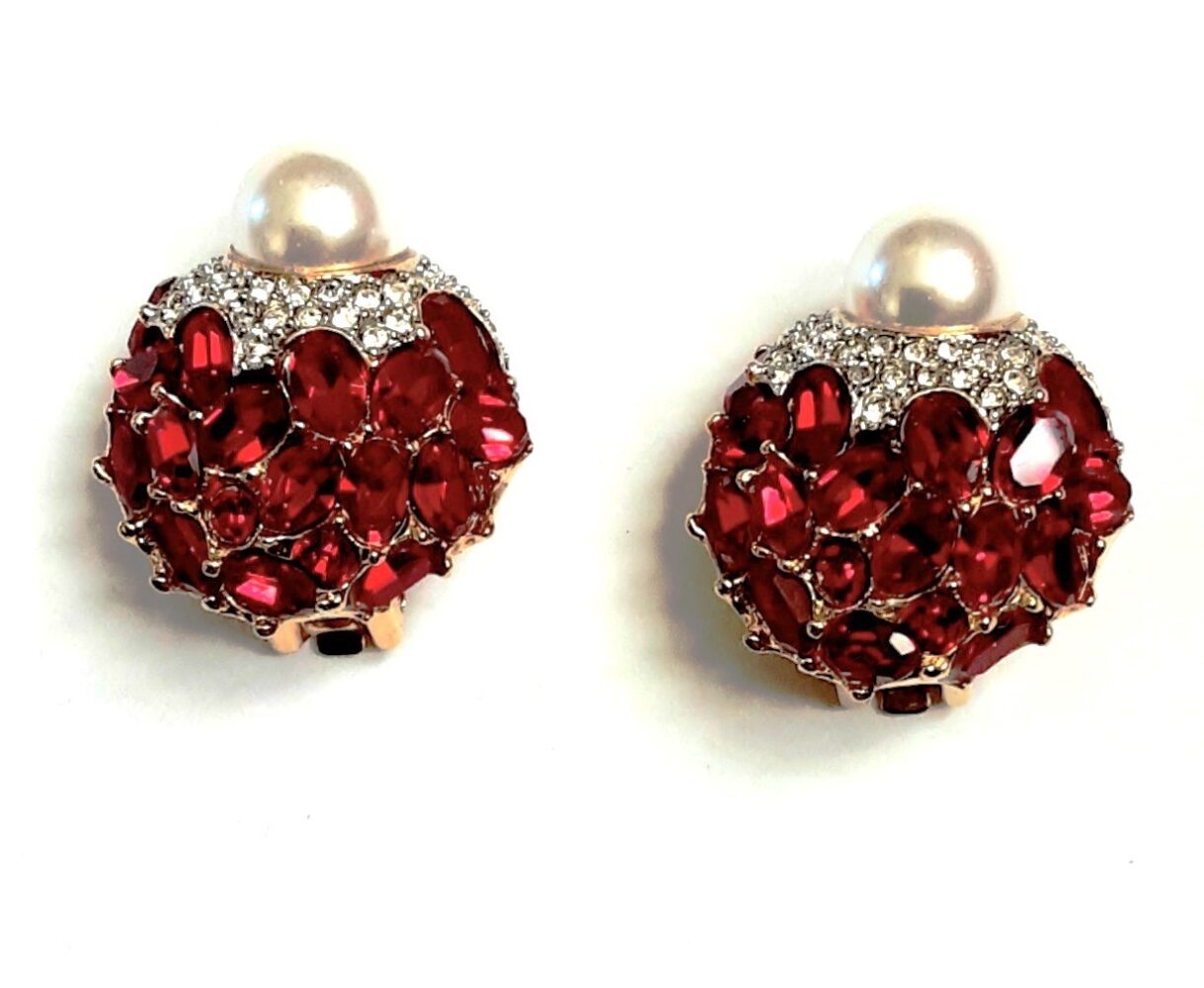 KENNETH LANE RED STONES, DIAMANTE, PEARLS CLIP EARRINGS